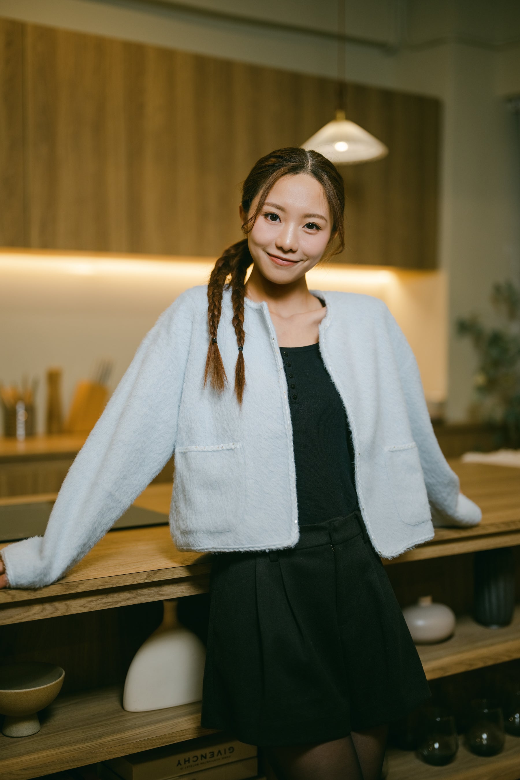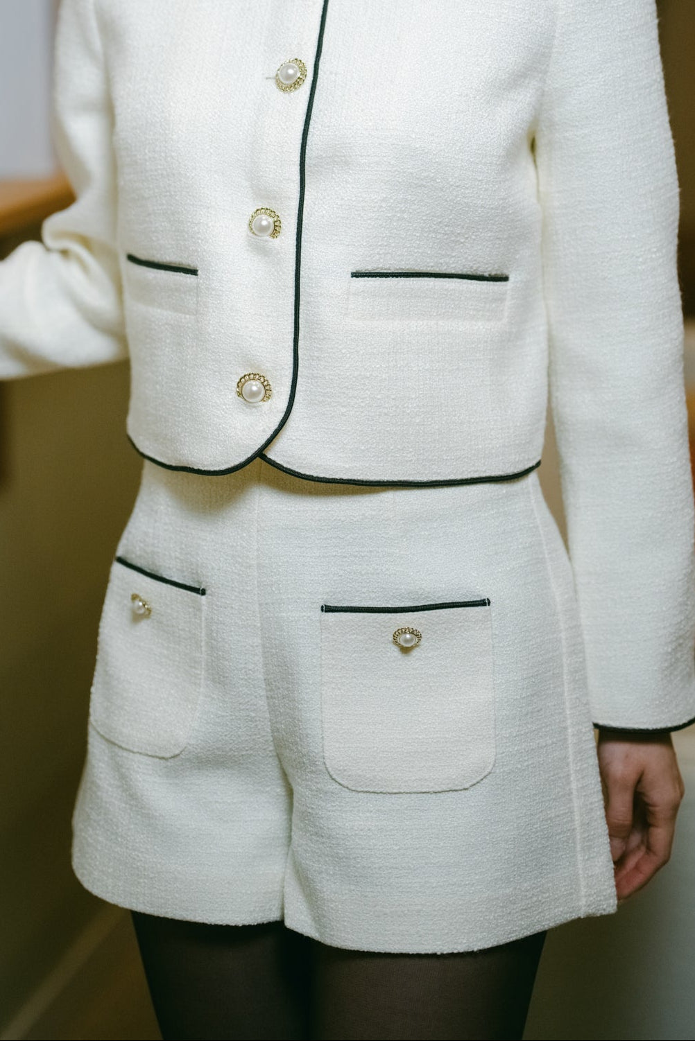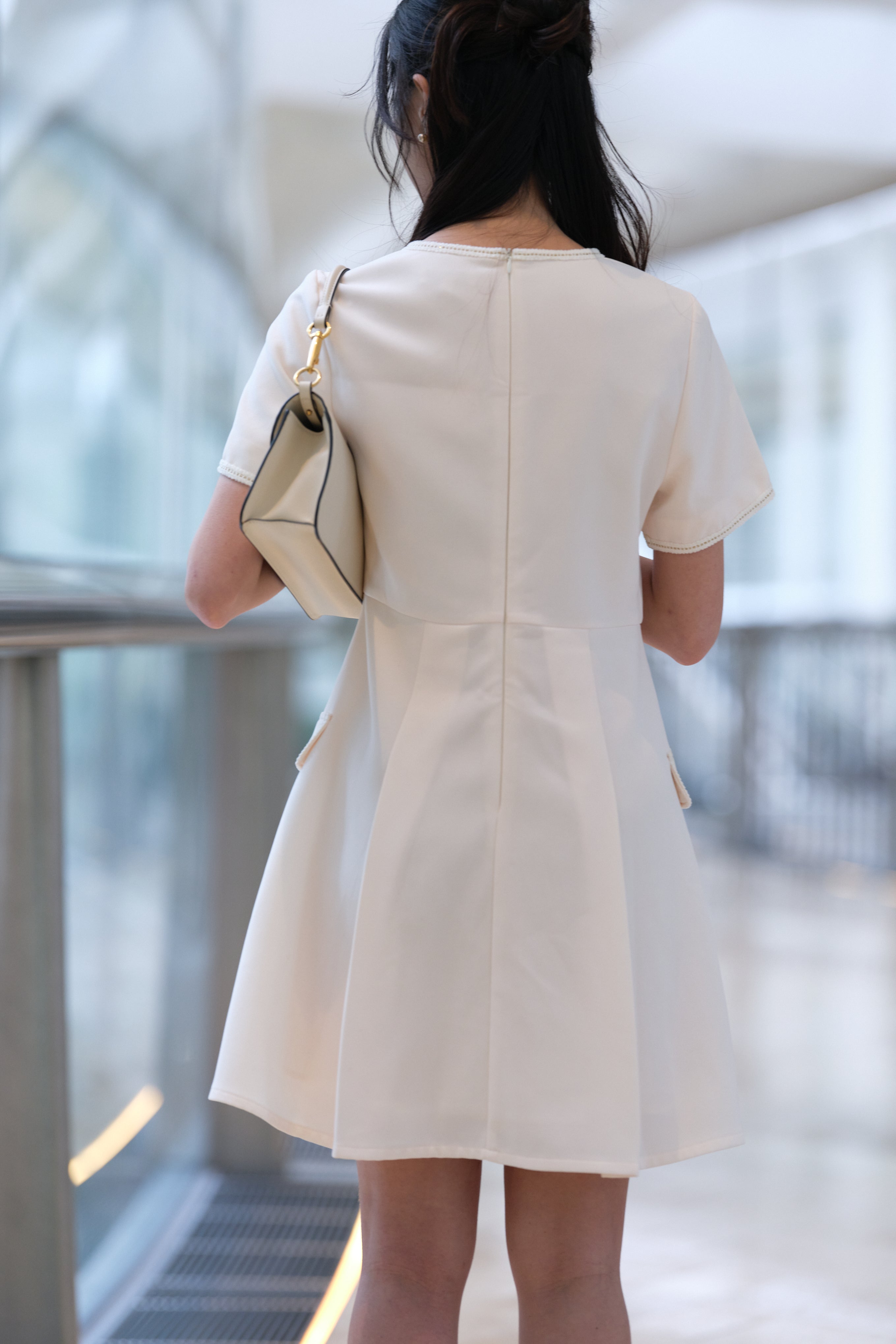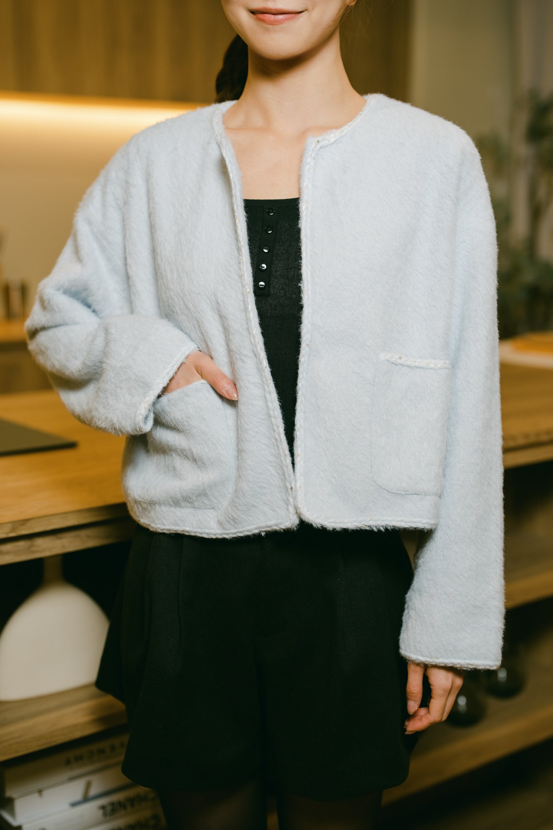 Pockets with stylish detailing, adding functionality.