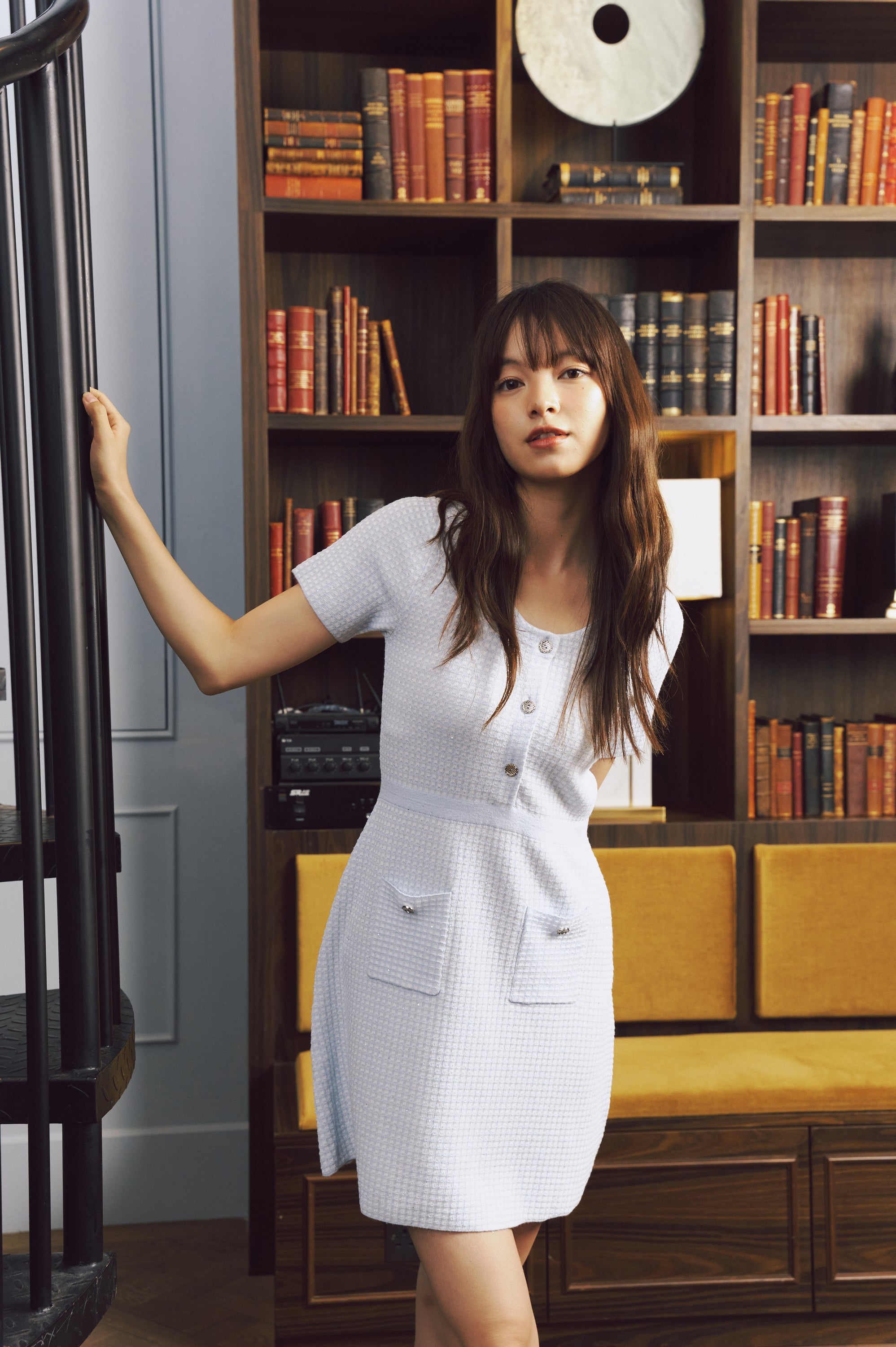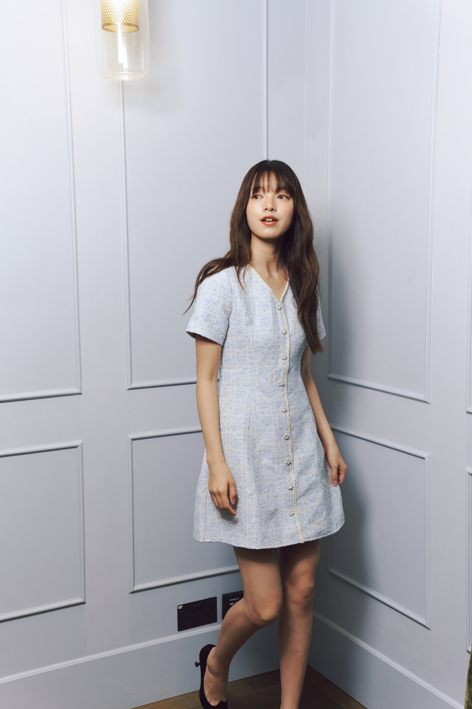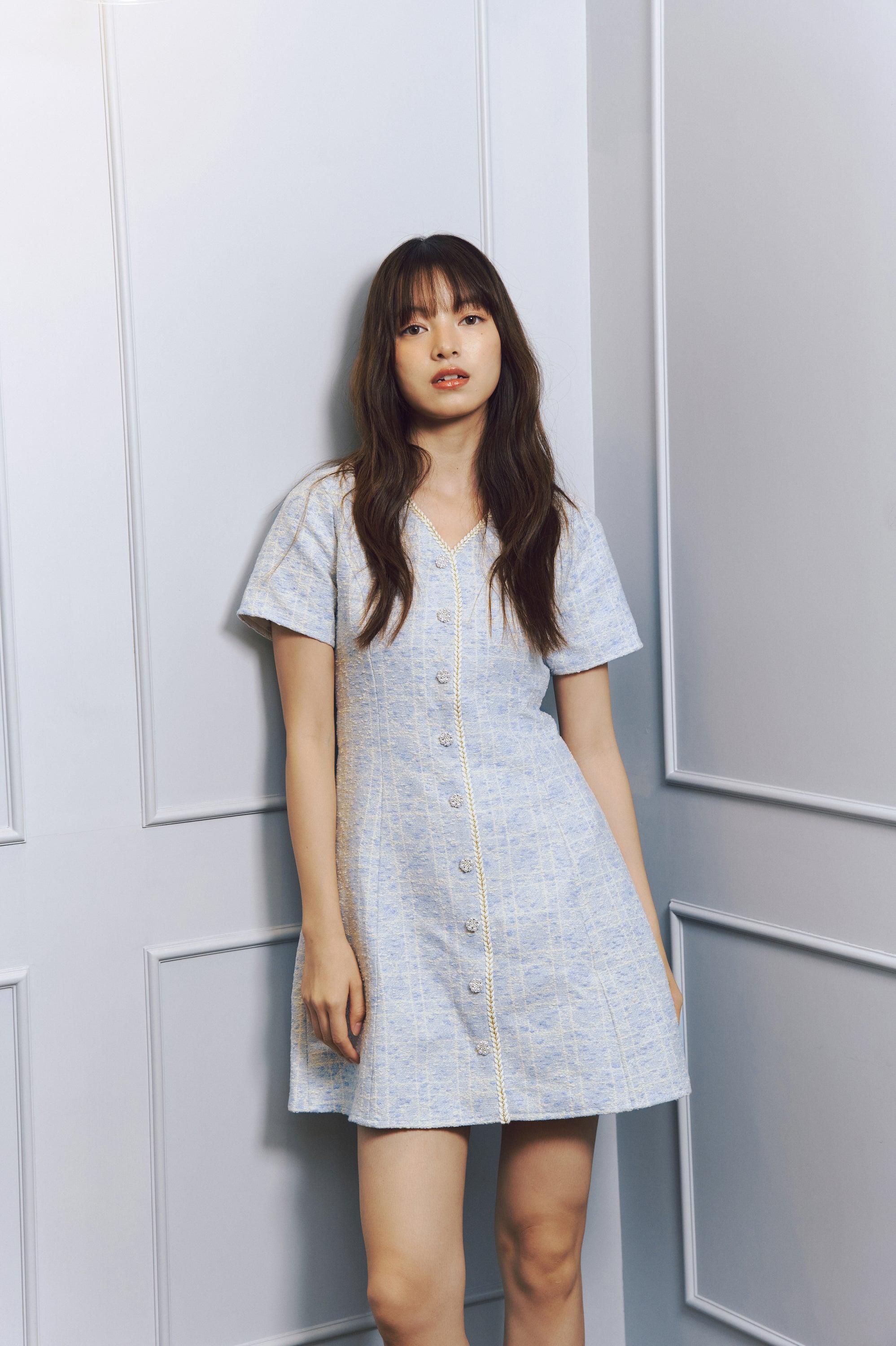 Flared skirt with pleats, enhancing the feminine shape.