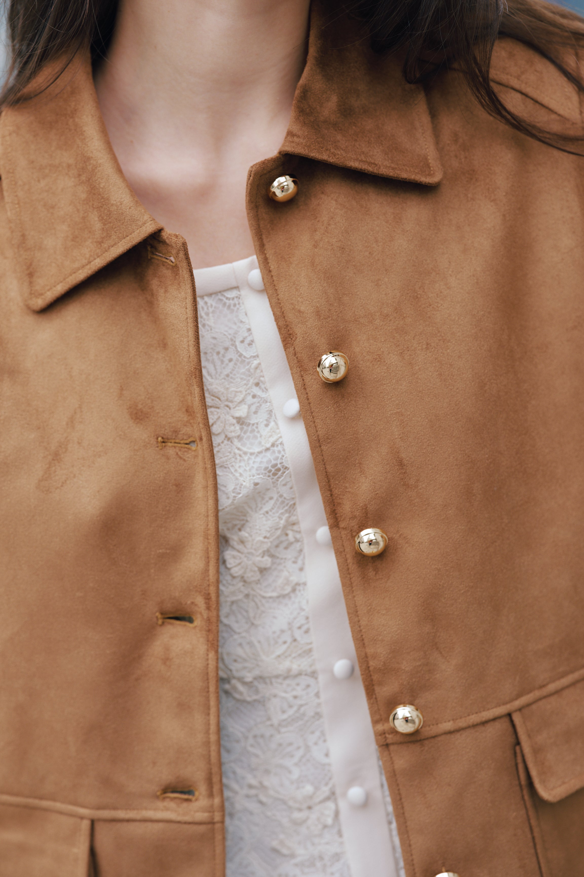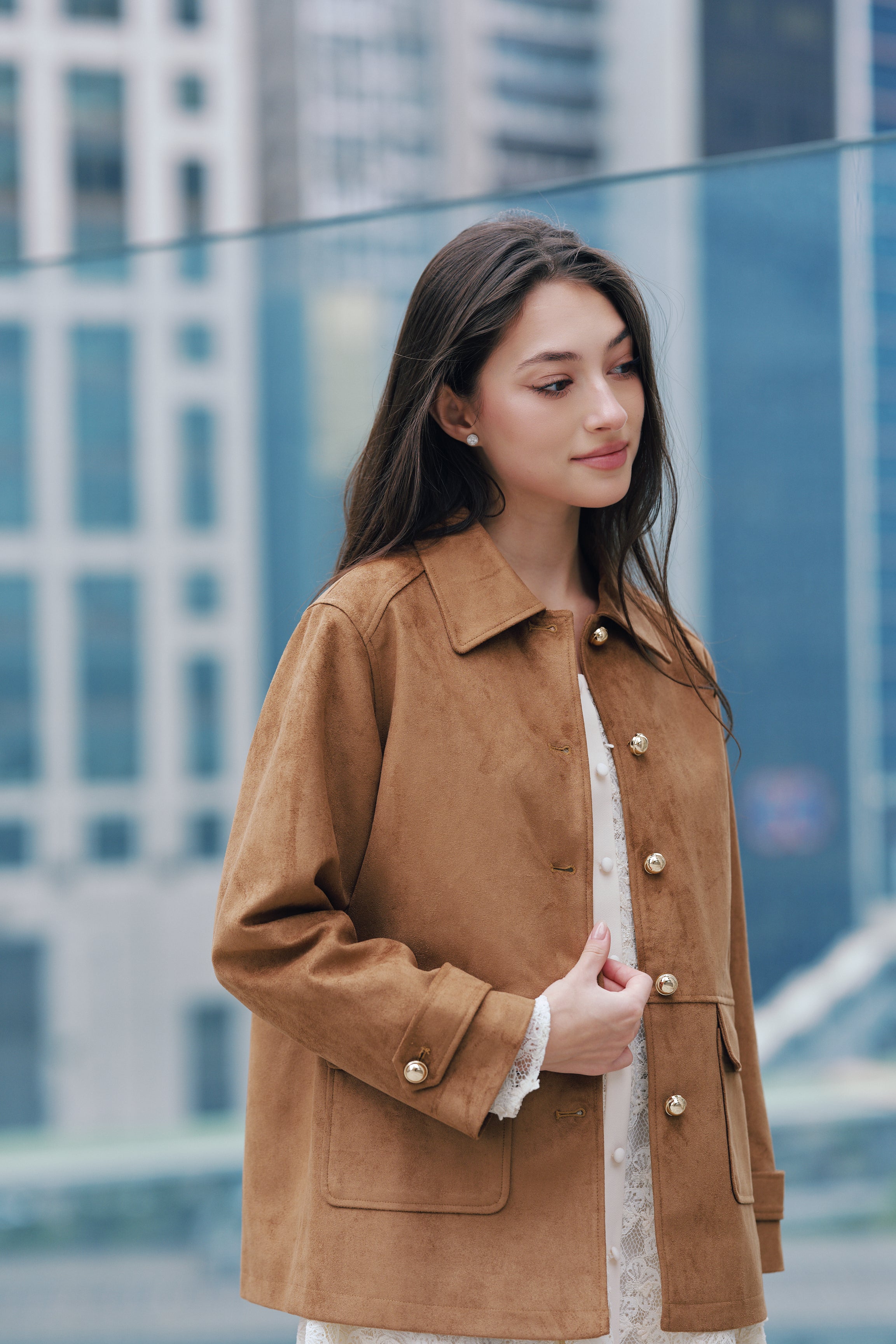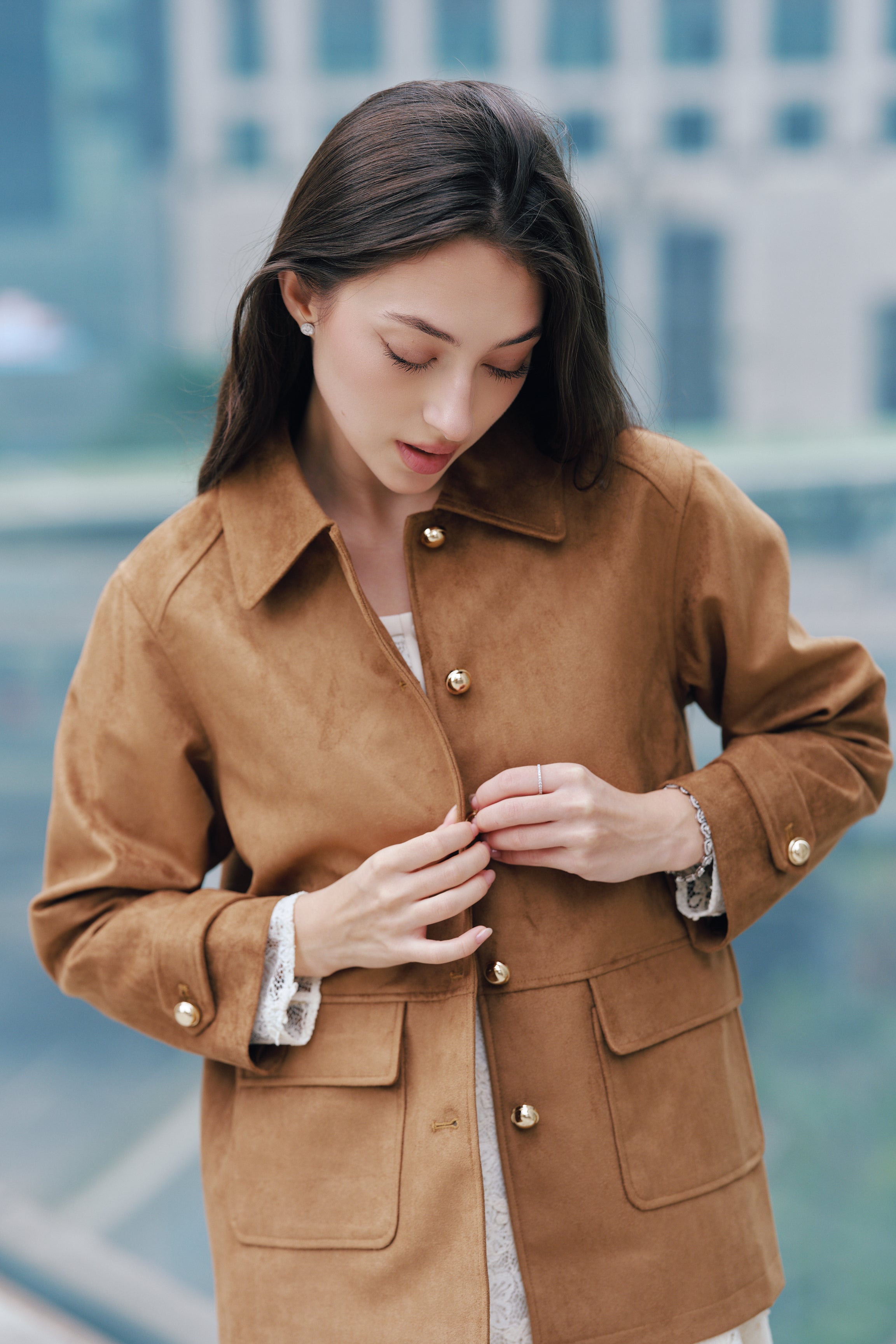 Features a classic button-up design with gold buttons, enhancing its elegance.