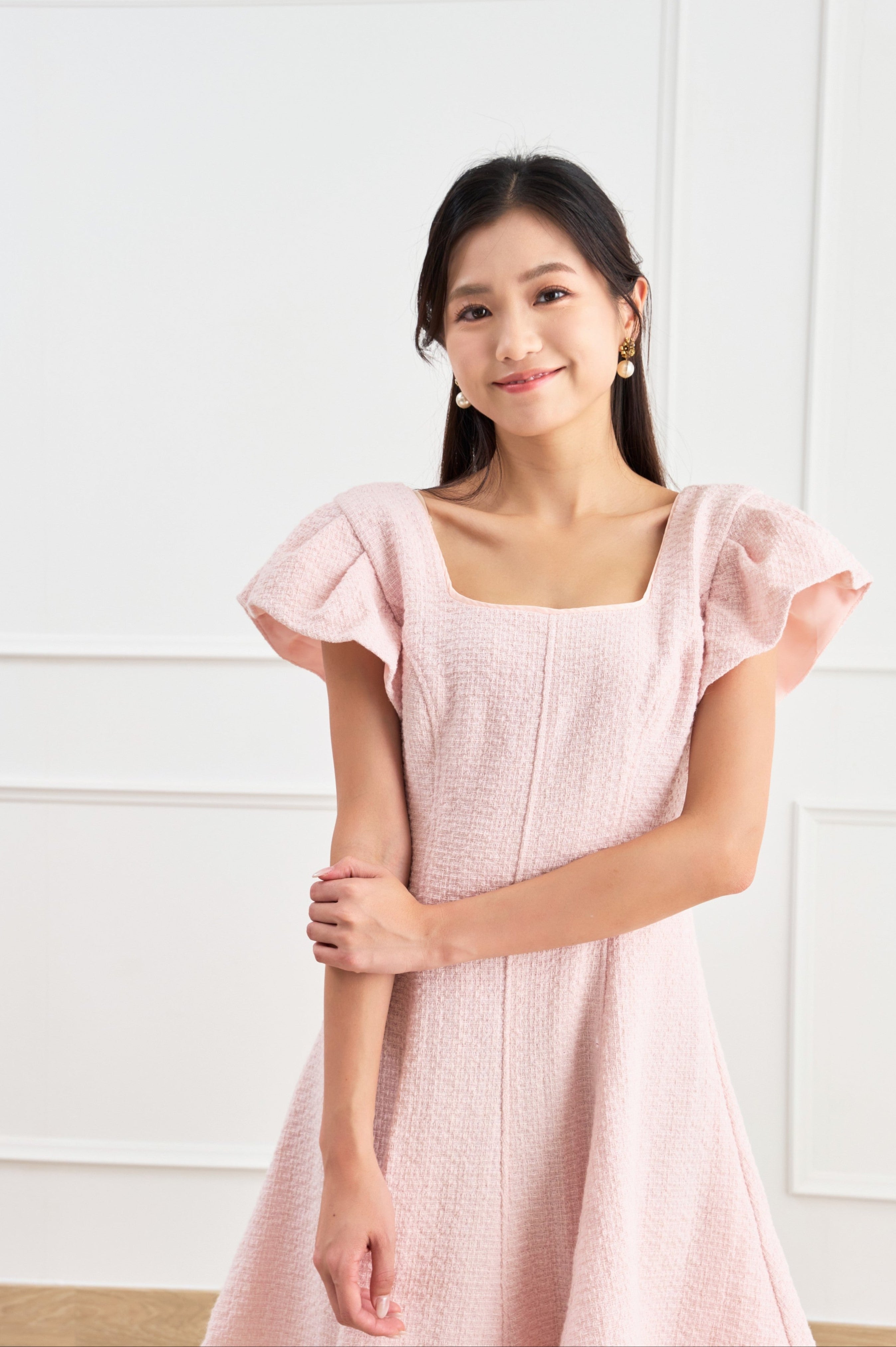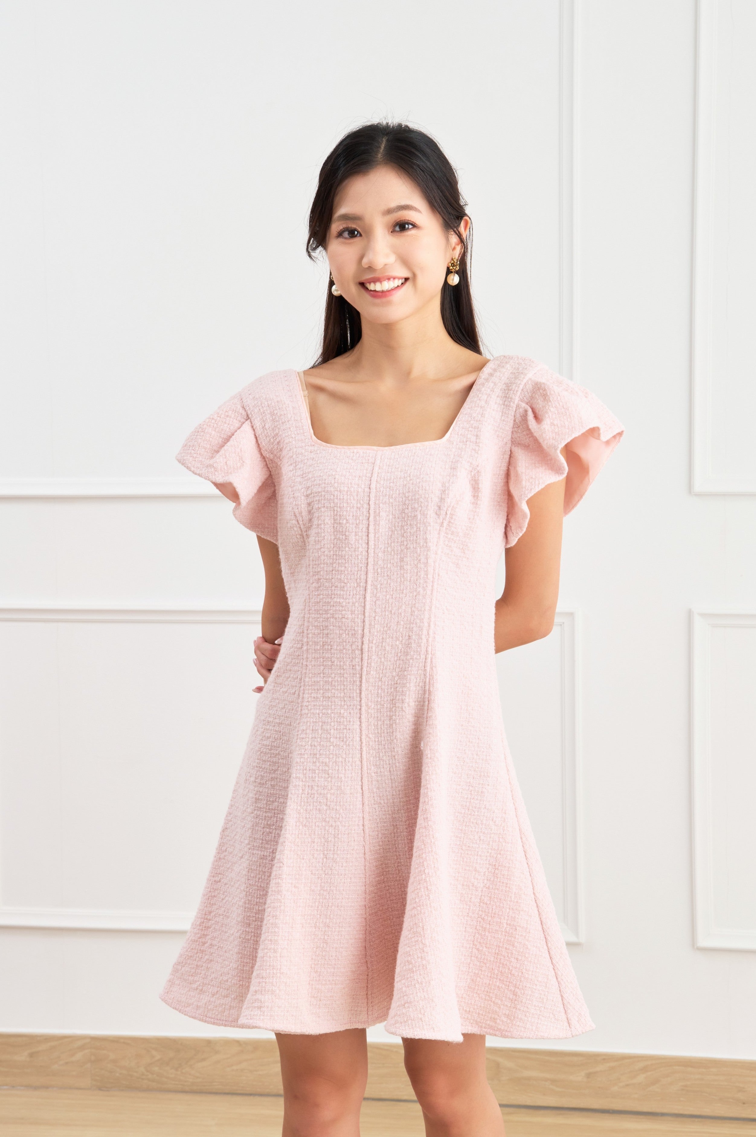 Features a charming square neckline and fluttery sleeves that add a touch of whimsy and femininity.