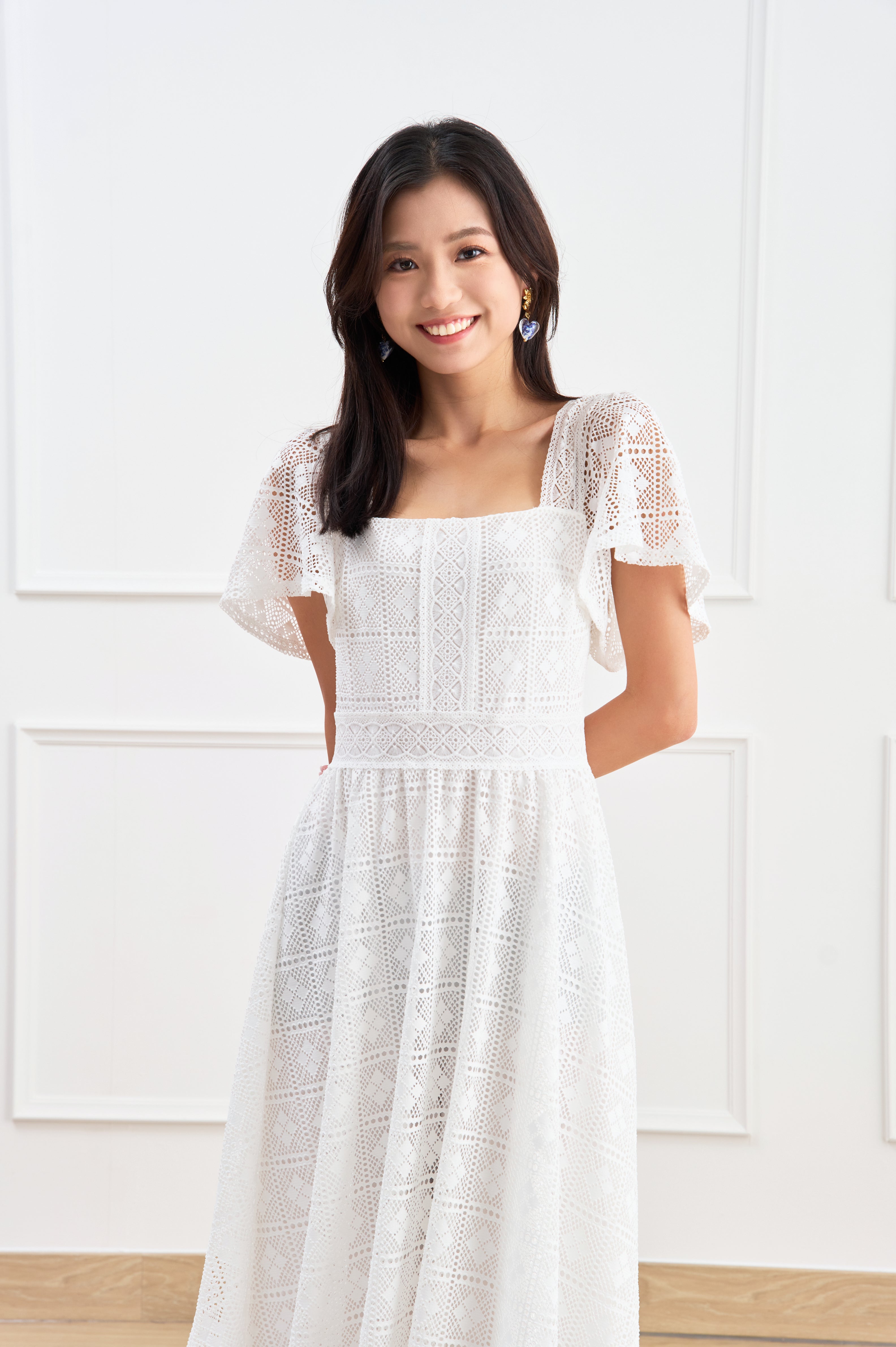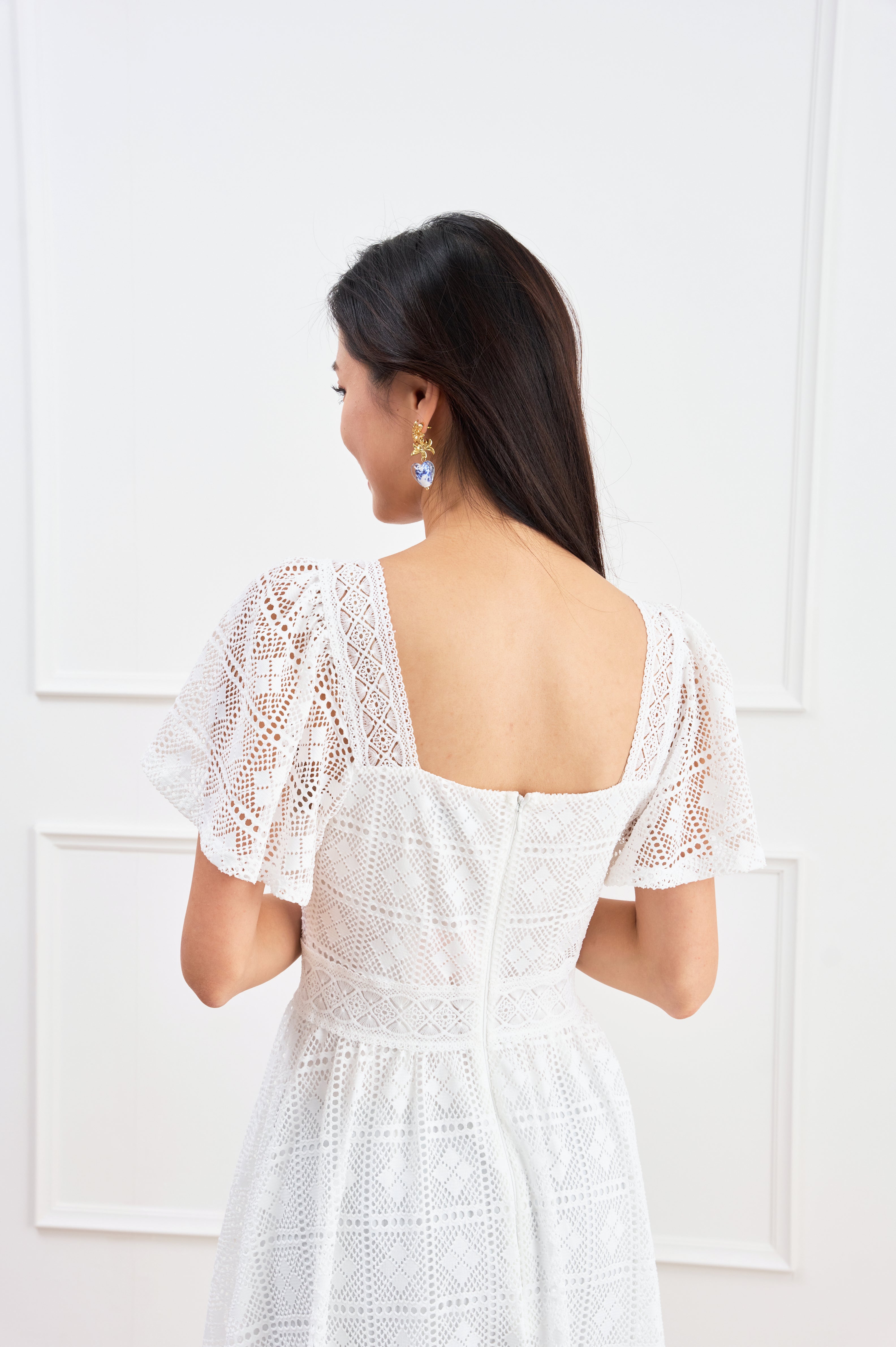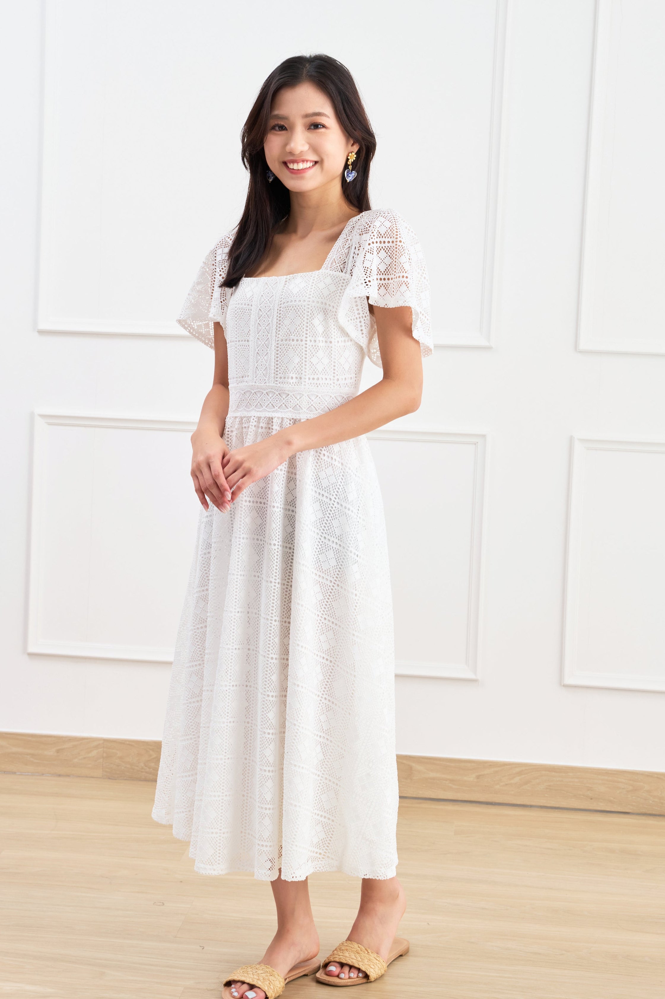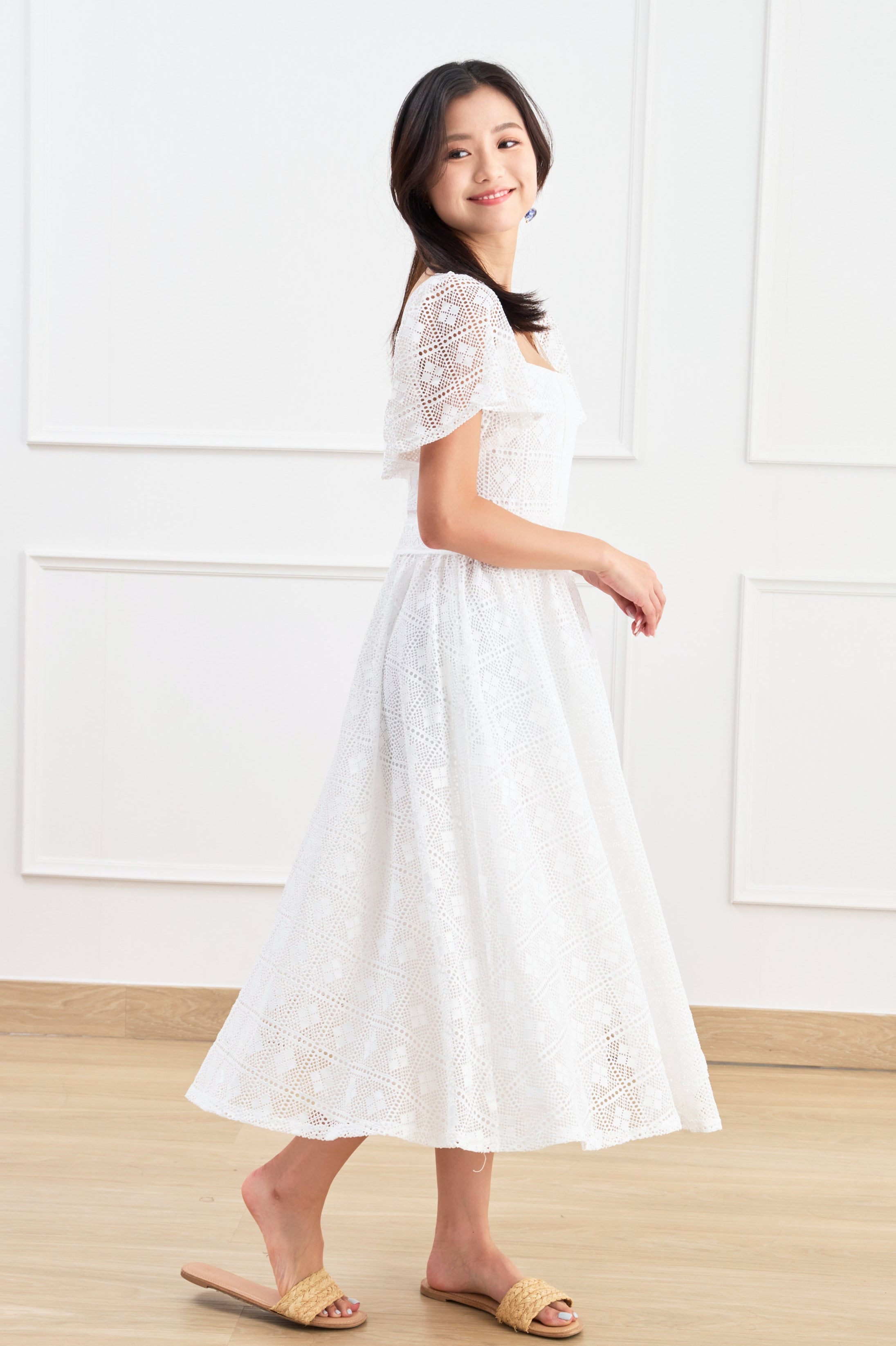 A mid-length white dress that exudes elegance and sophistication.