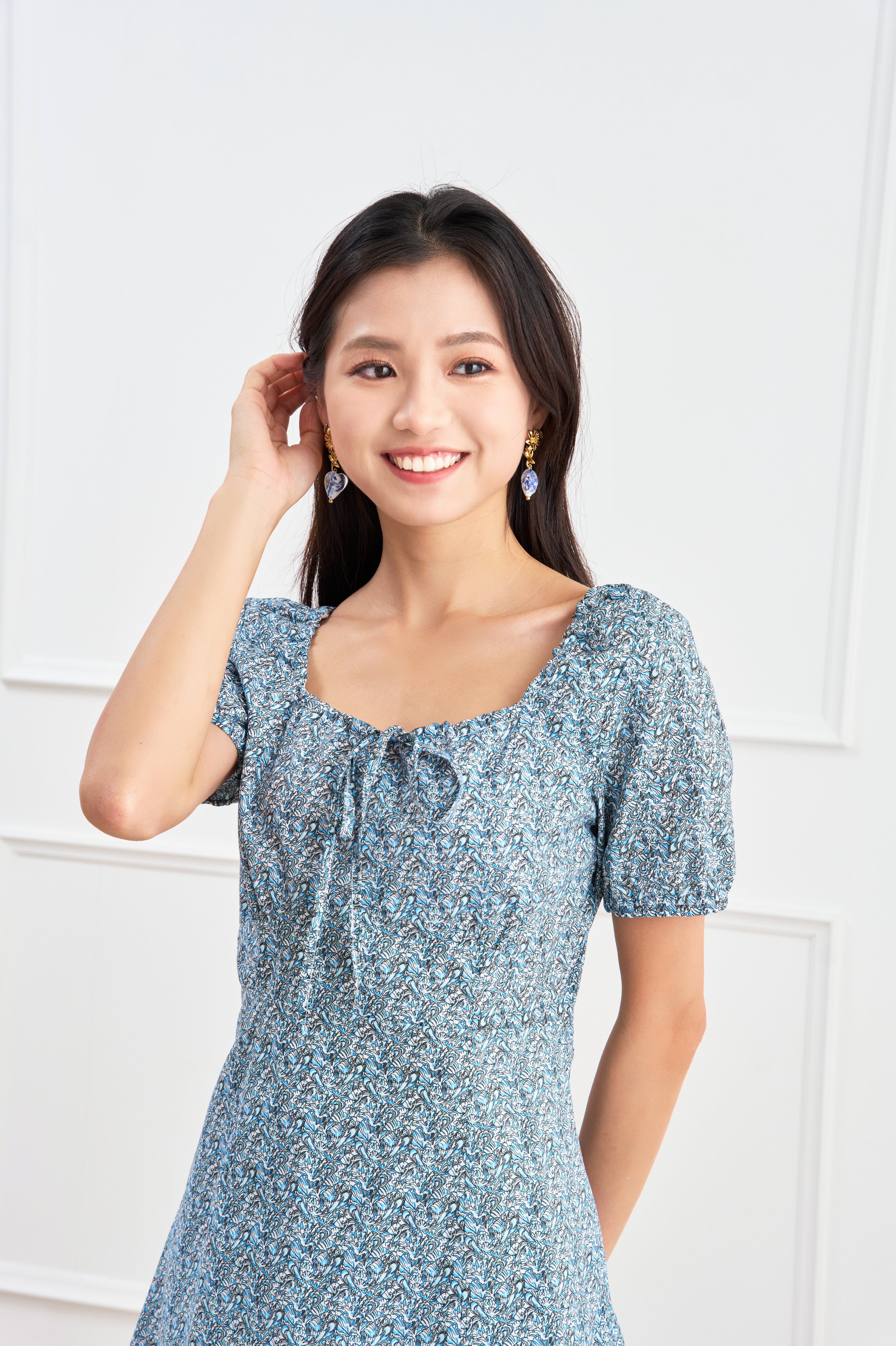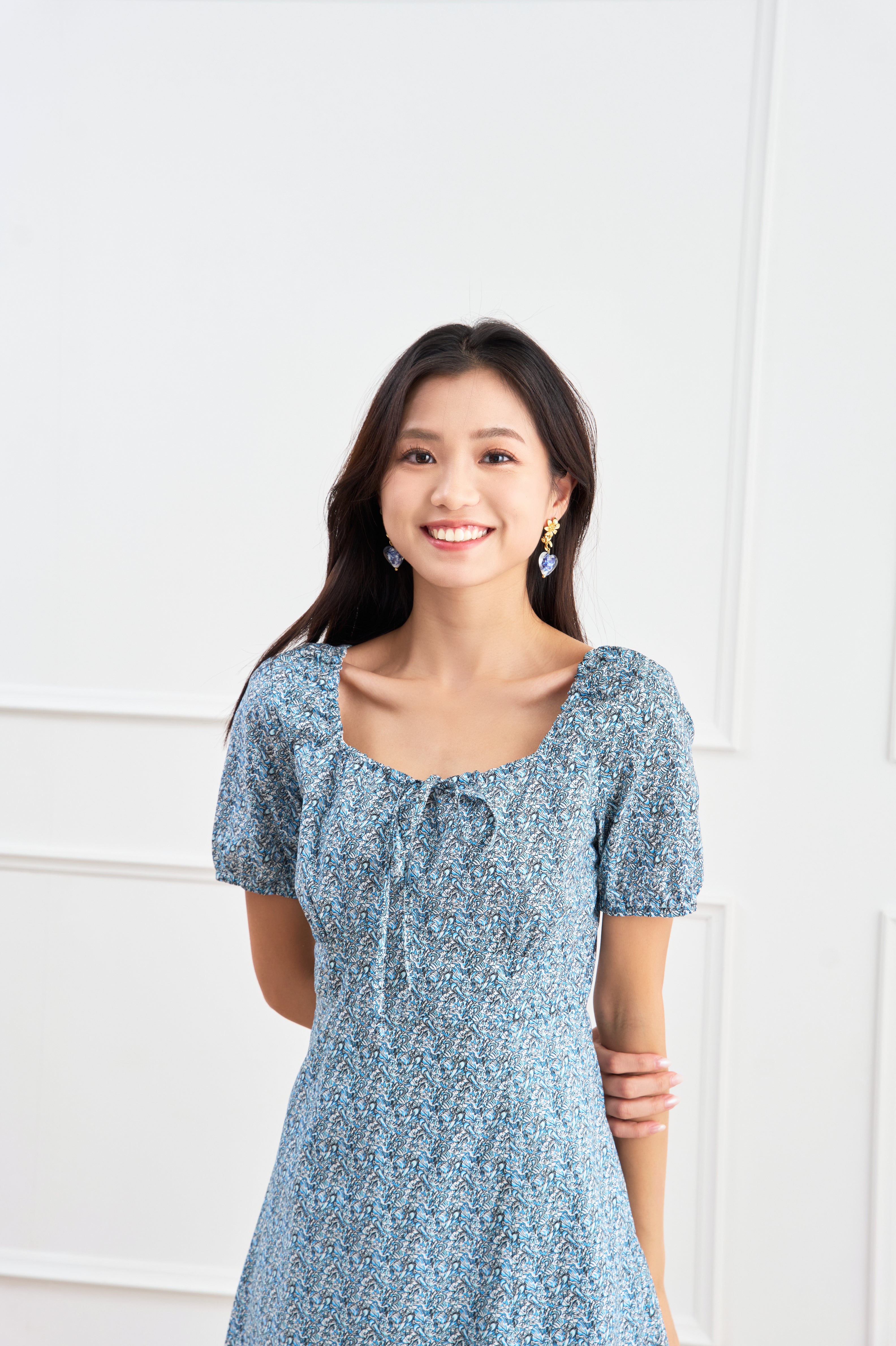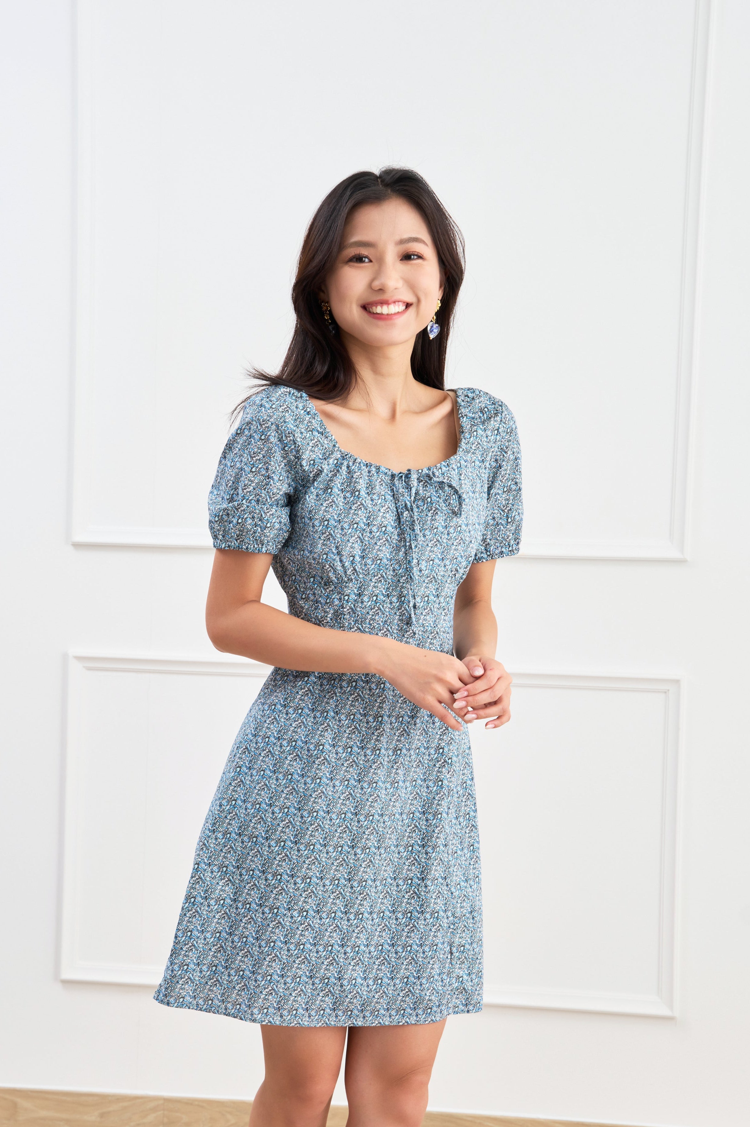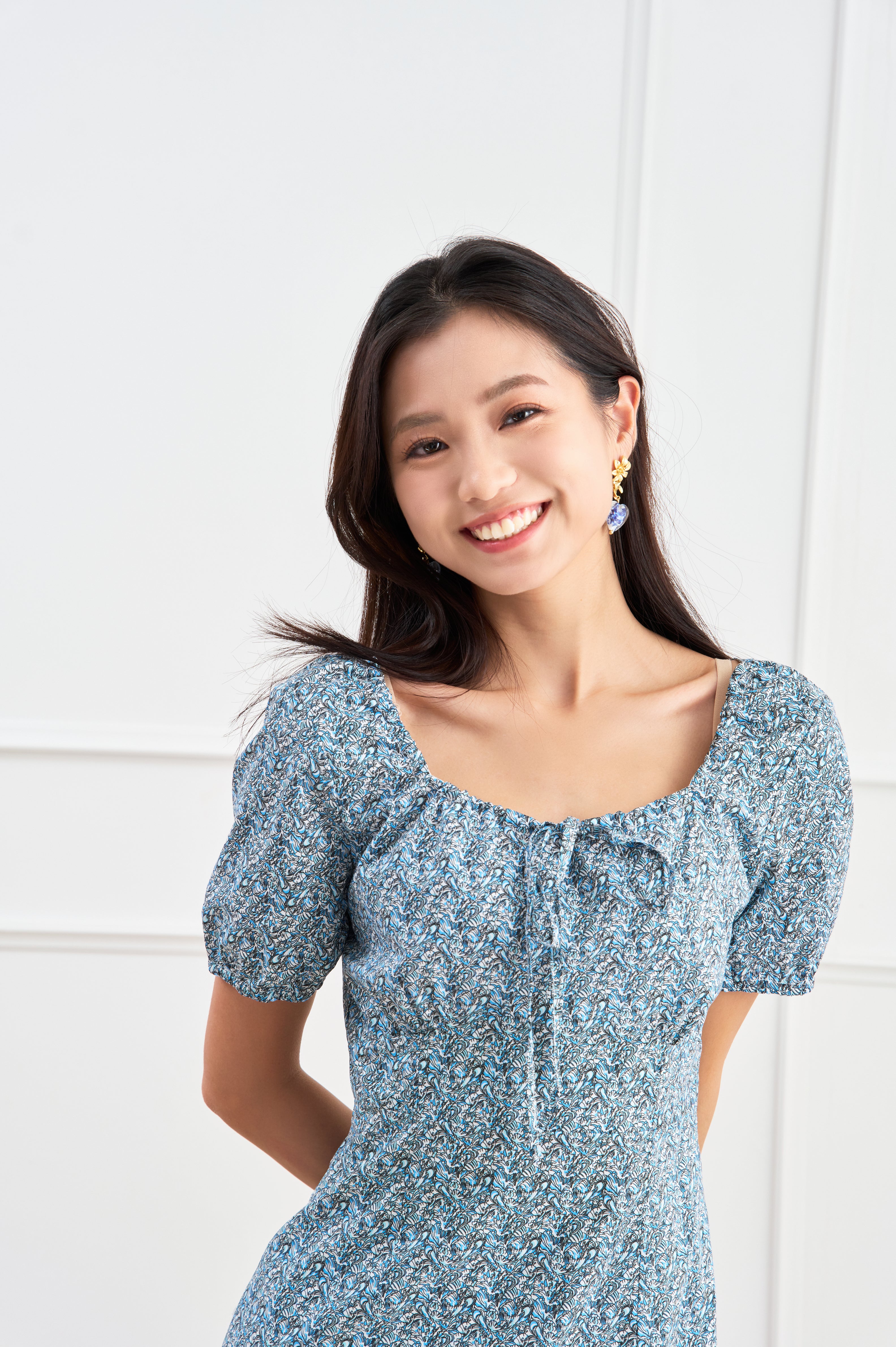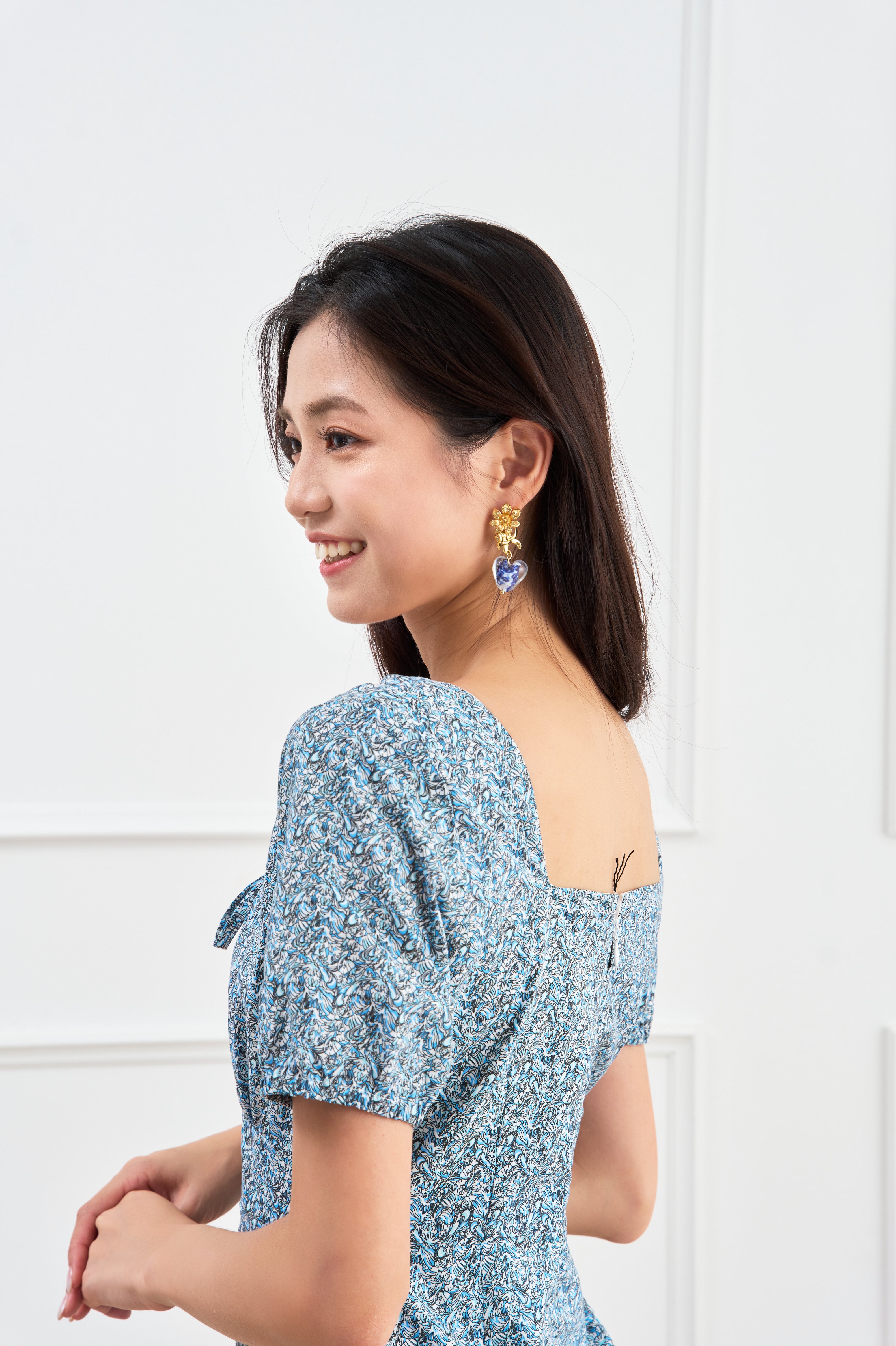 Features a lovely blue floral print, perfect for a fresh and feminine look.