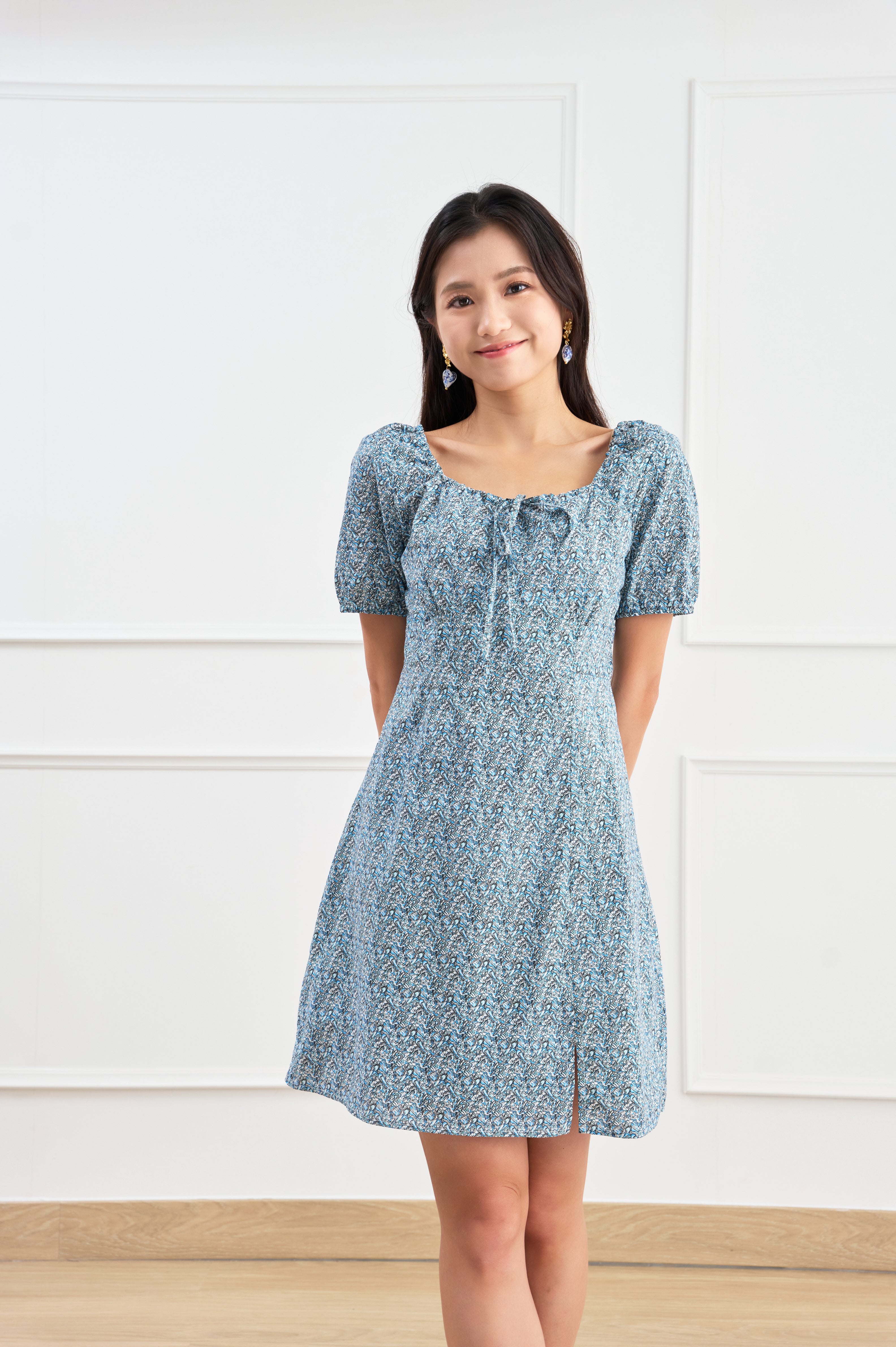 It has a square neckline and short puffed sleeves that add a touch of romance to the design.