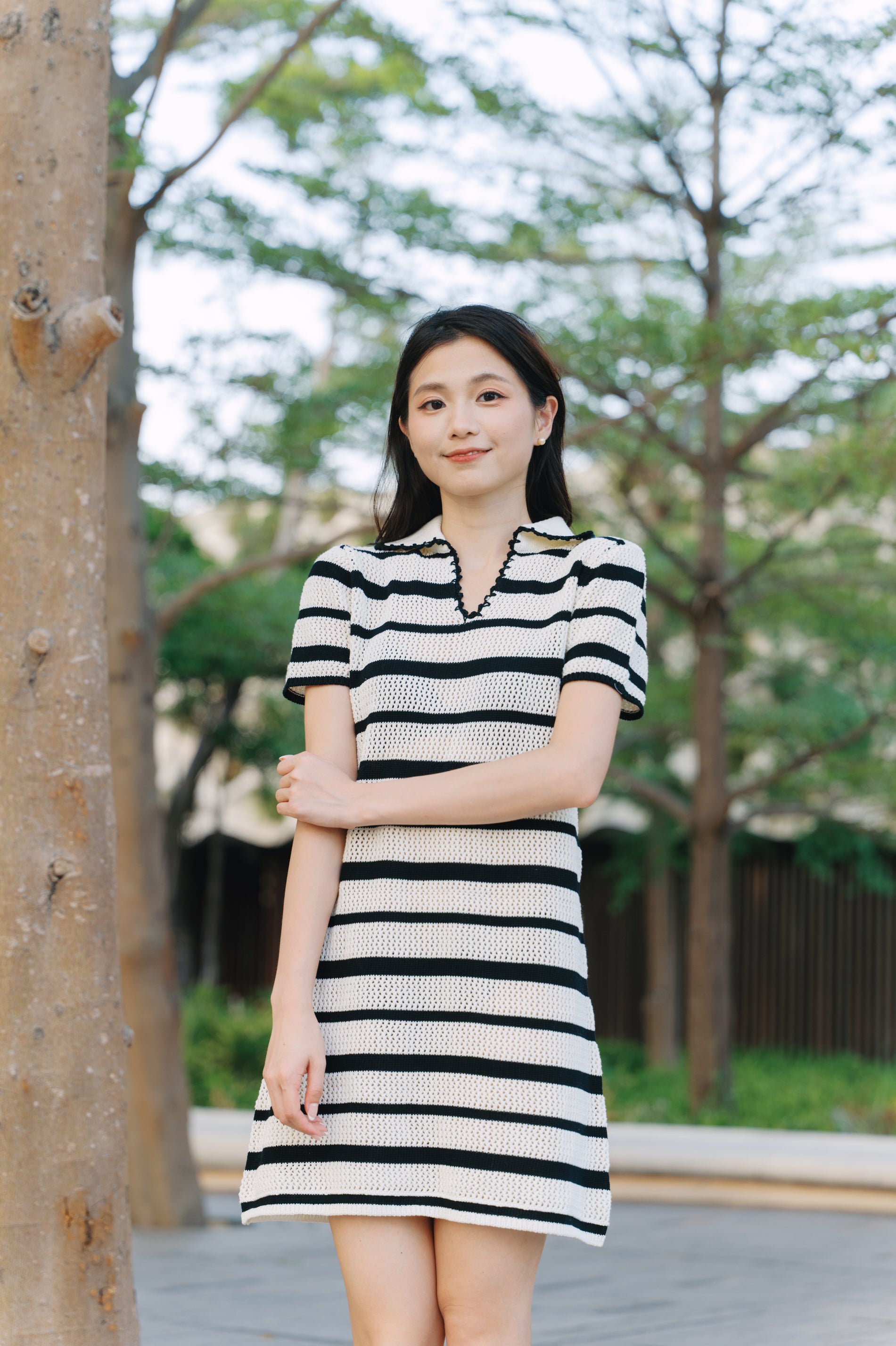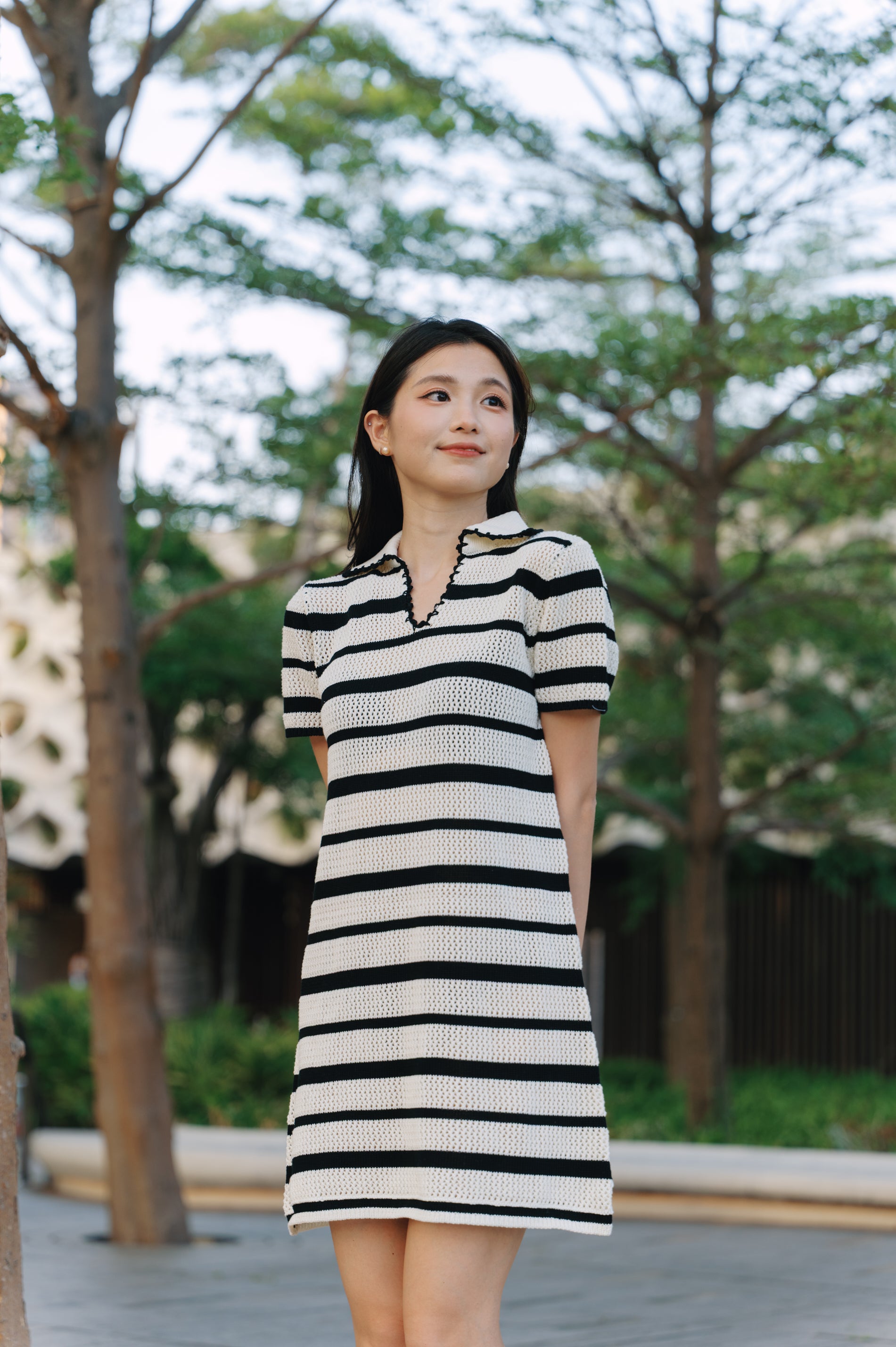 This stylish black and white striped dress features textured knit design that adds depth and interest.
