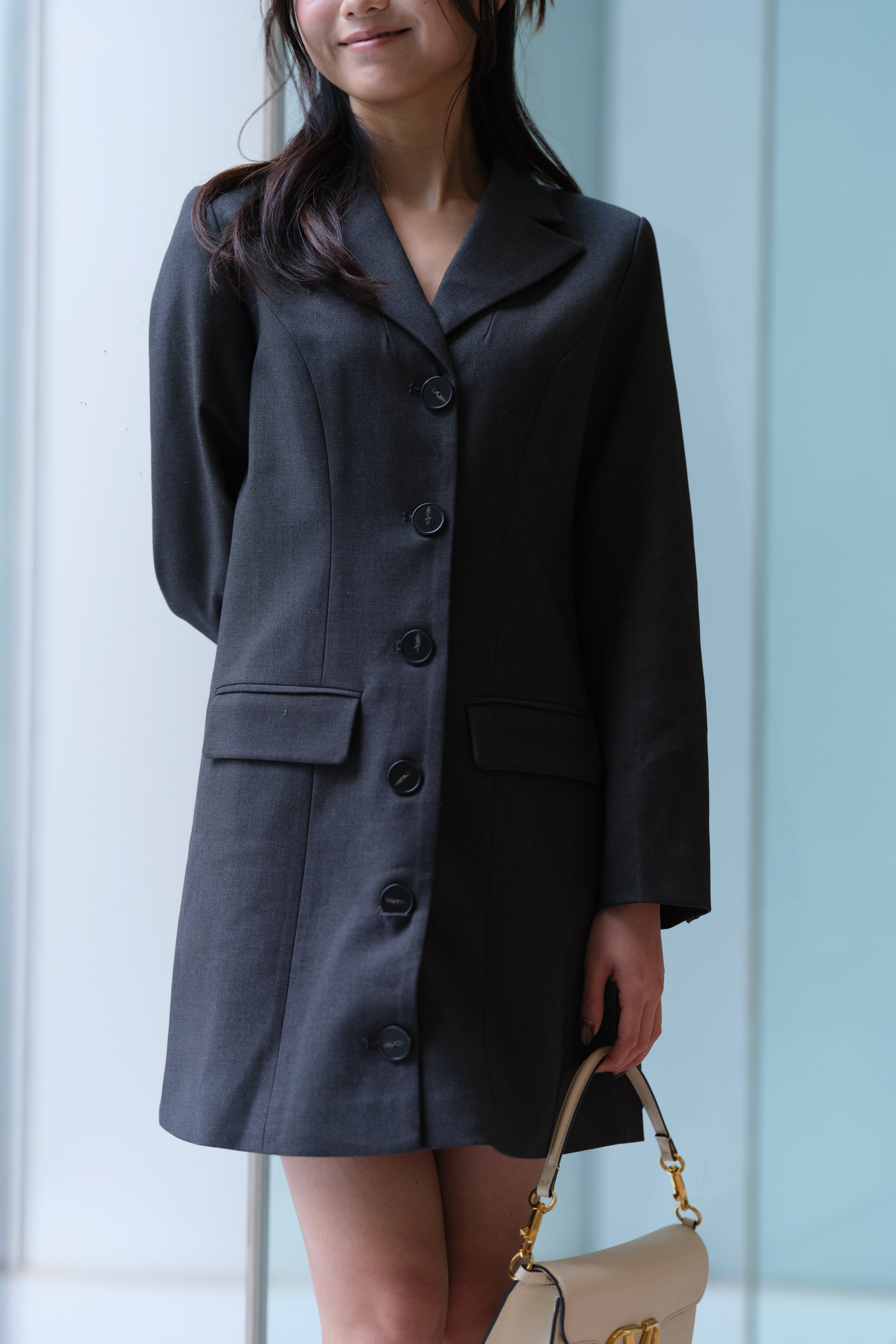 Tailored fit, resembling a blazer dress that combines elegance with a structured silhouette.