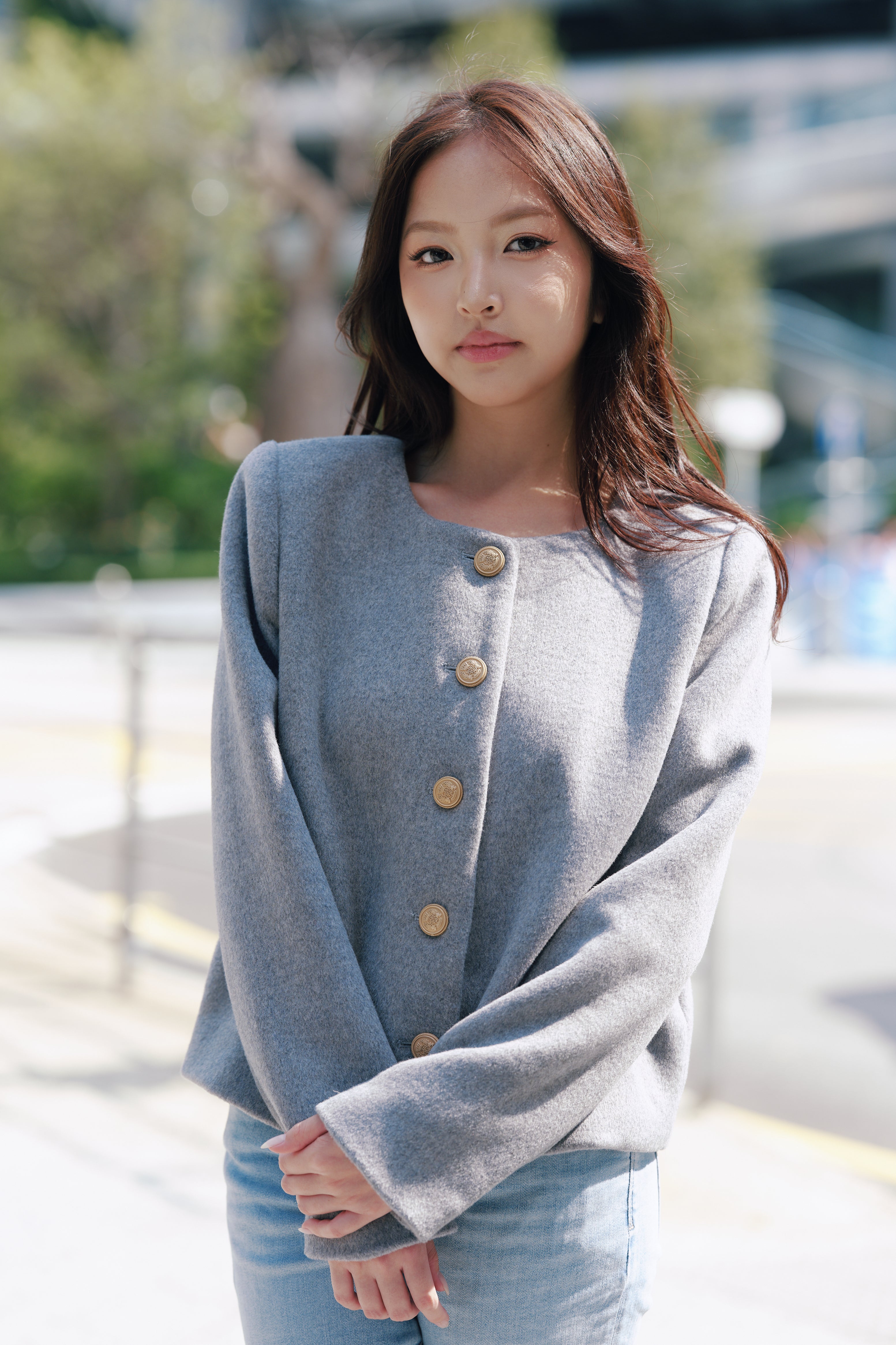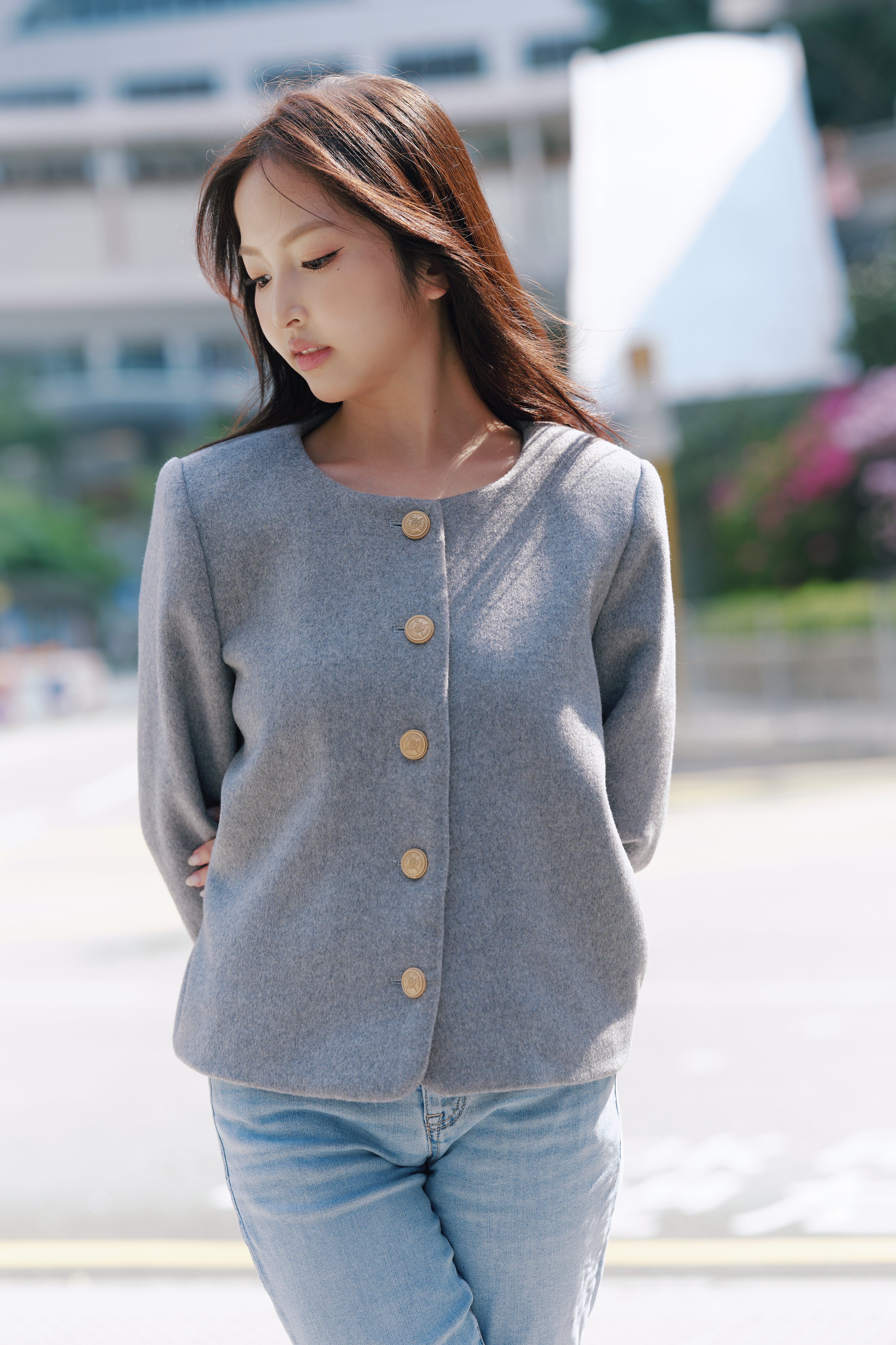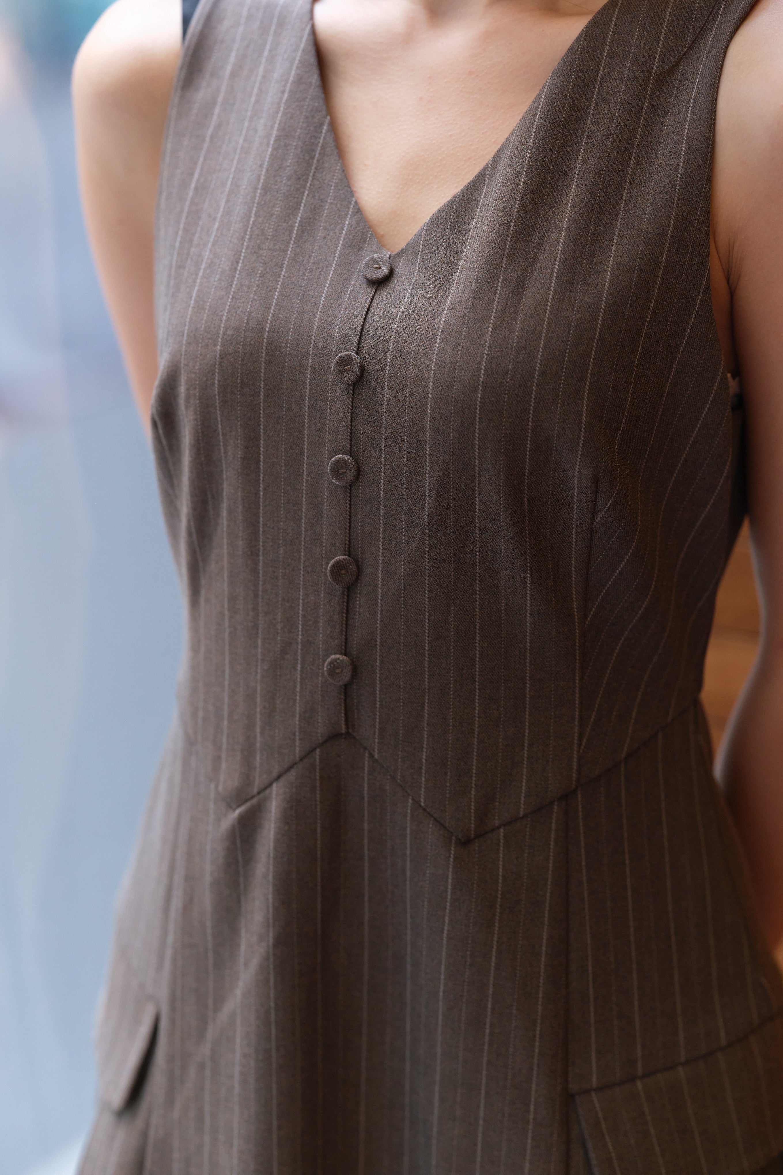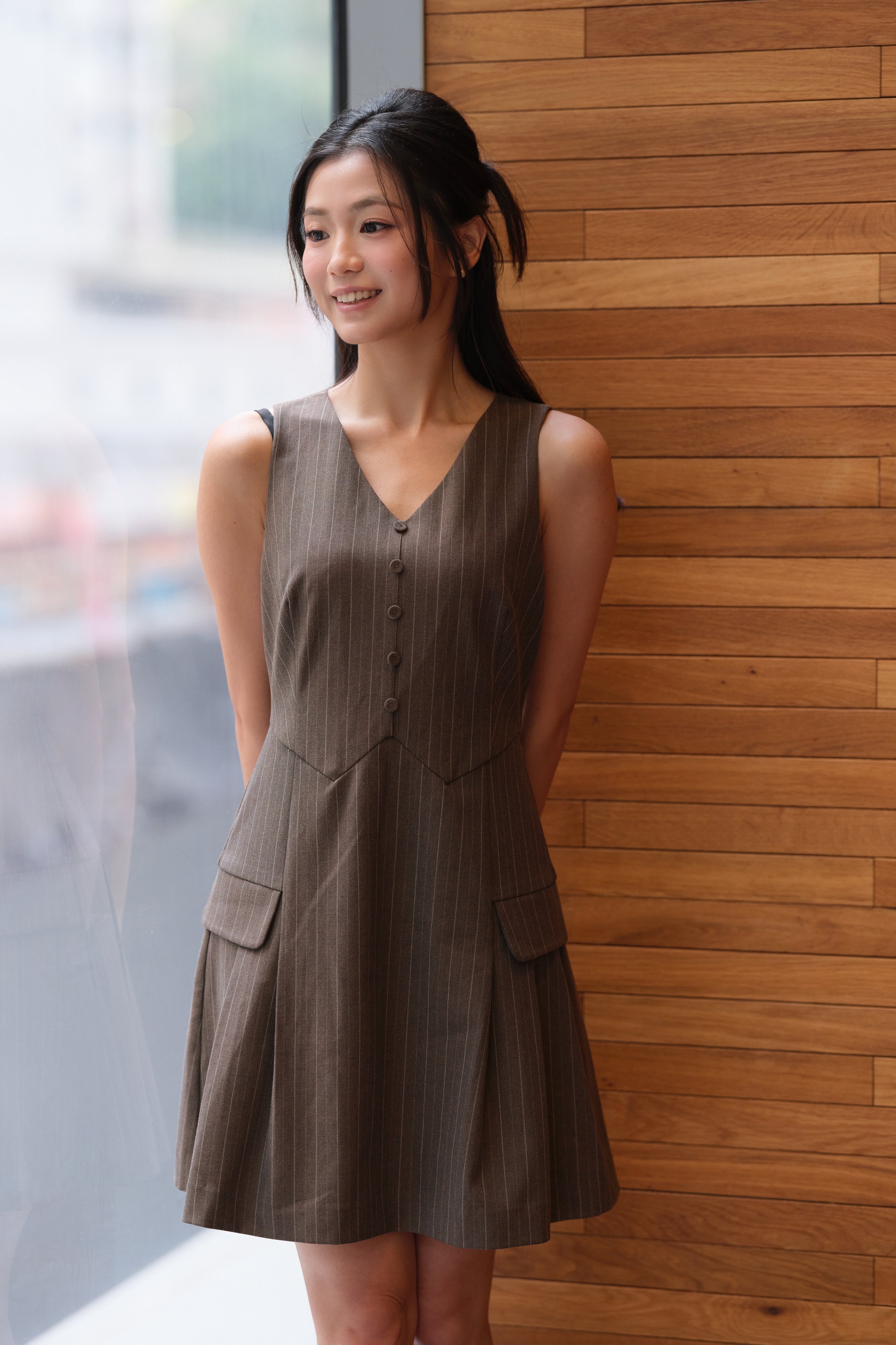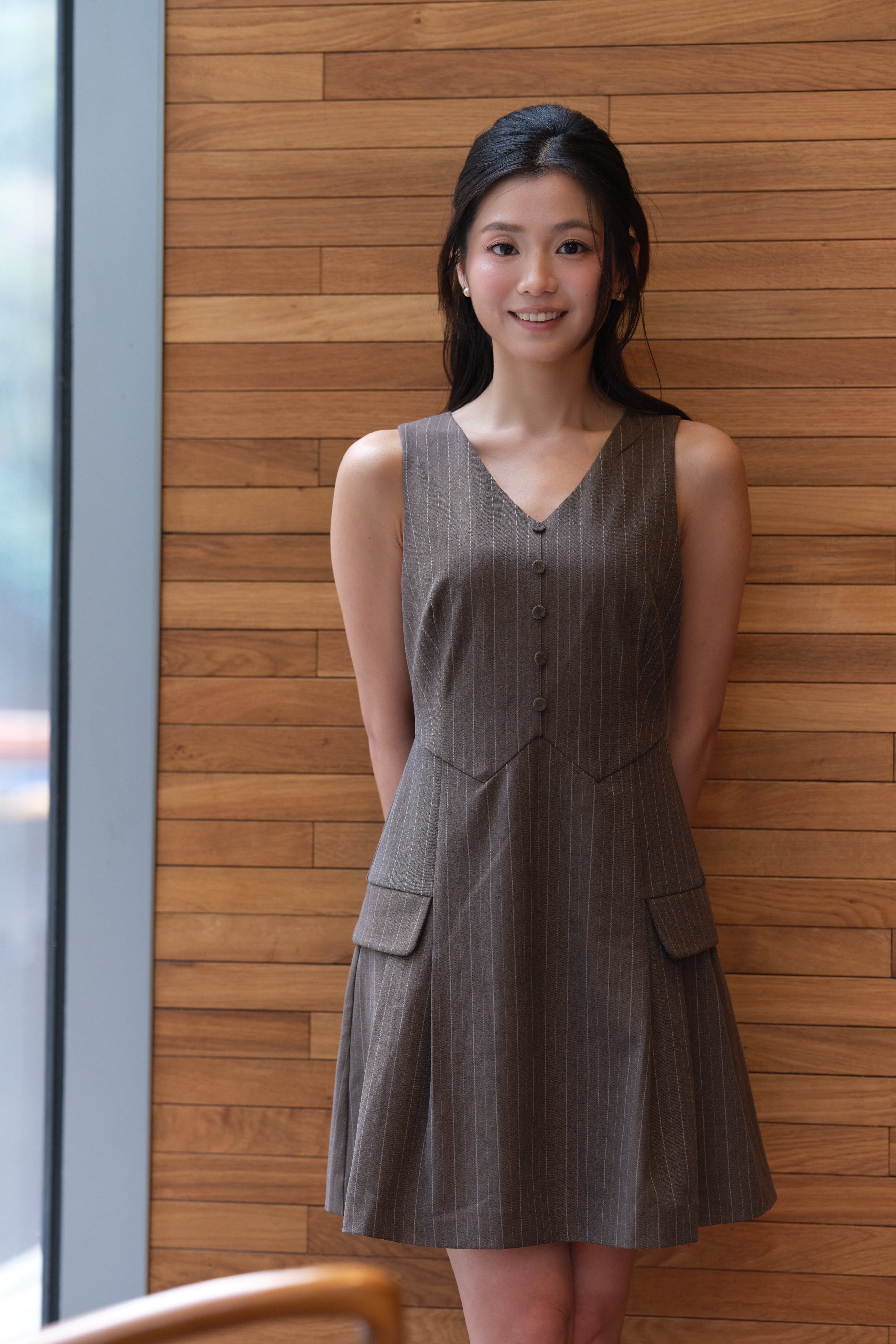 Pockets with stylish detailing, adding functionality.